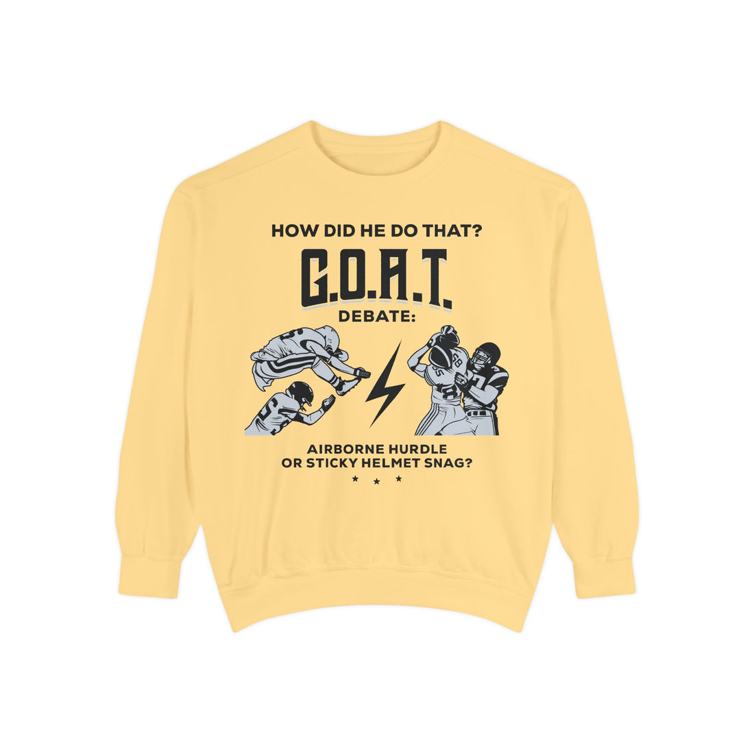 🏈⚡ G.O.A.T. Football Debate Sweatshirt – Airborne Hurdle or Sticky Helmet Snag? | G.O.A.T. Talk Tees