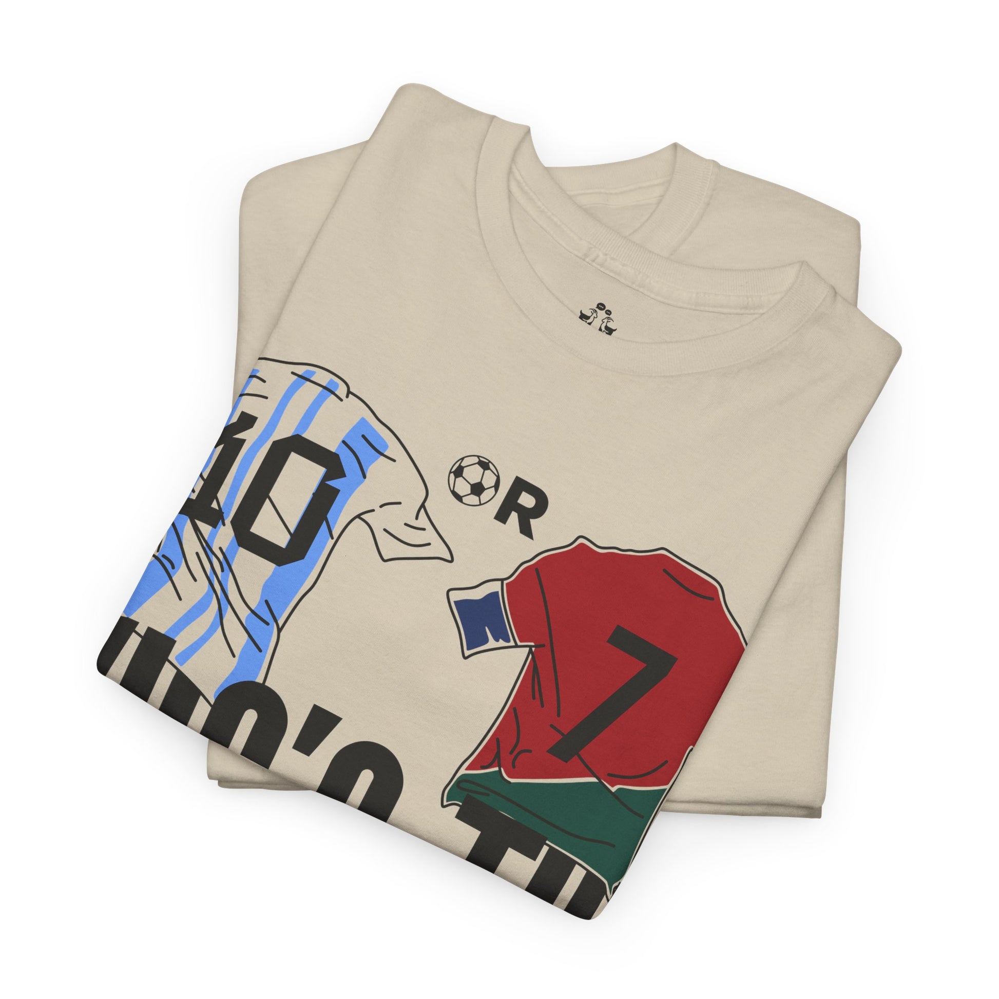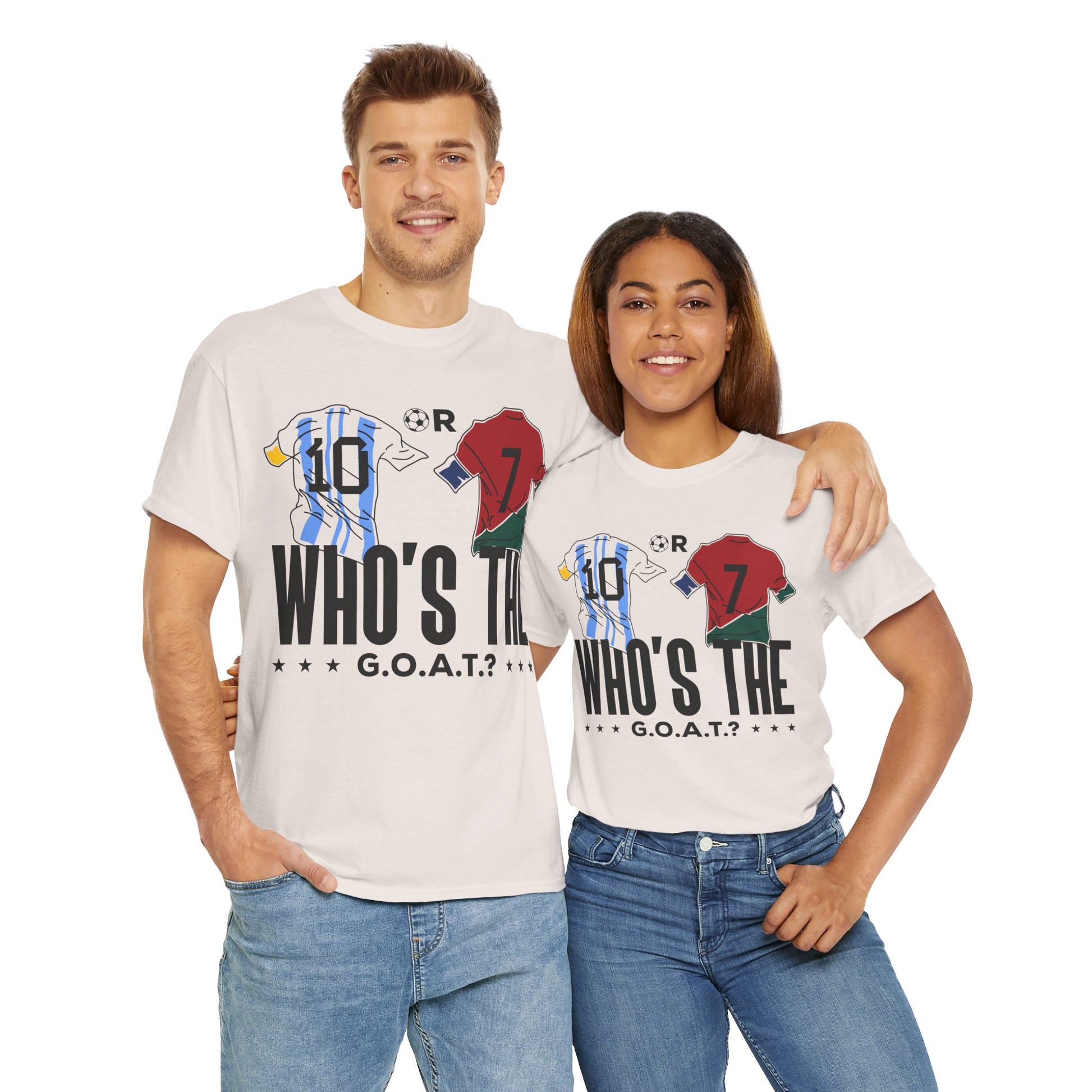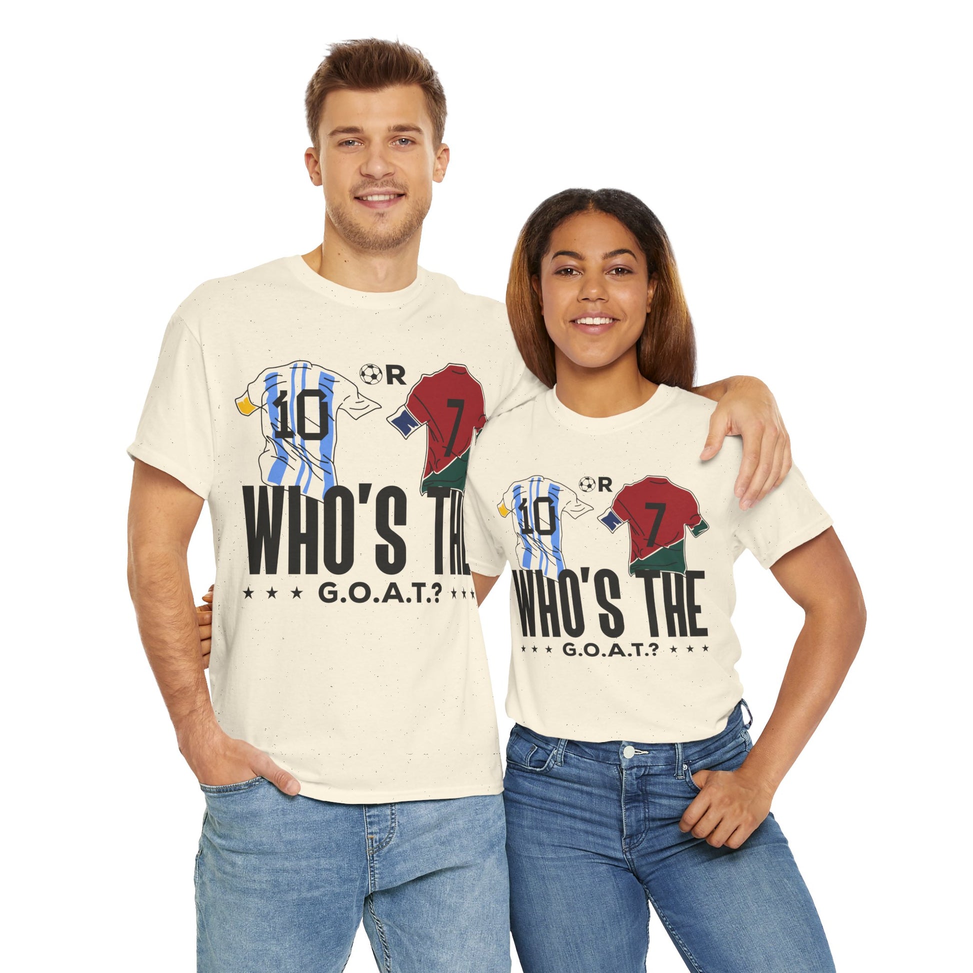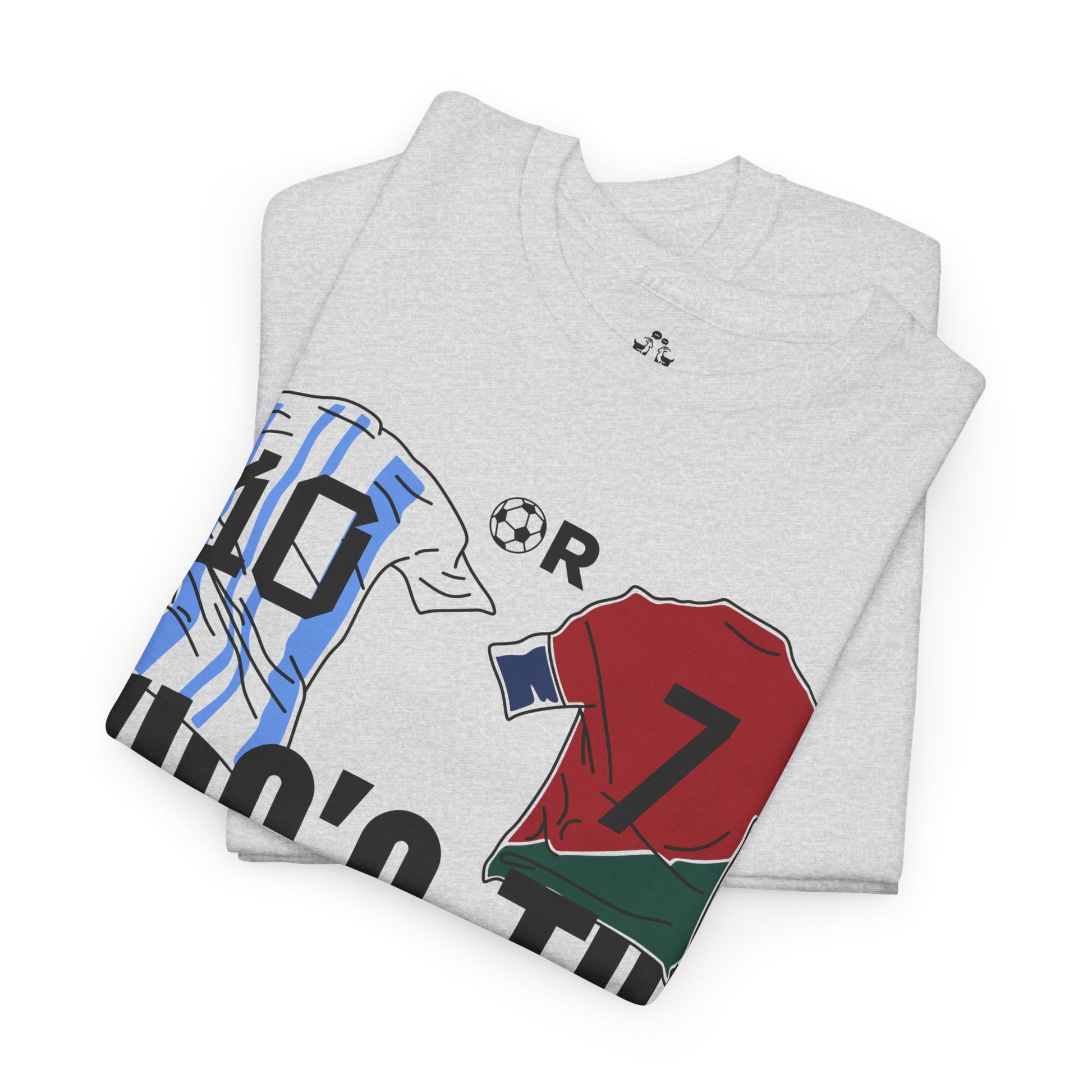 Spark the ultimate soccer debate with this bold "10 or 7 – Who's the G.O.A.T.?" tee. Featuring Argentina and Portugal flag graphics inside the numbers, this shirt lets fans rep their pick between the two football legends. A must-have for Messi or Ronaldo supporters and lovers of the greatest football rivalry of all time.