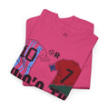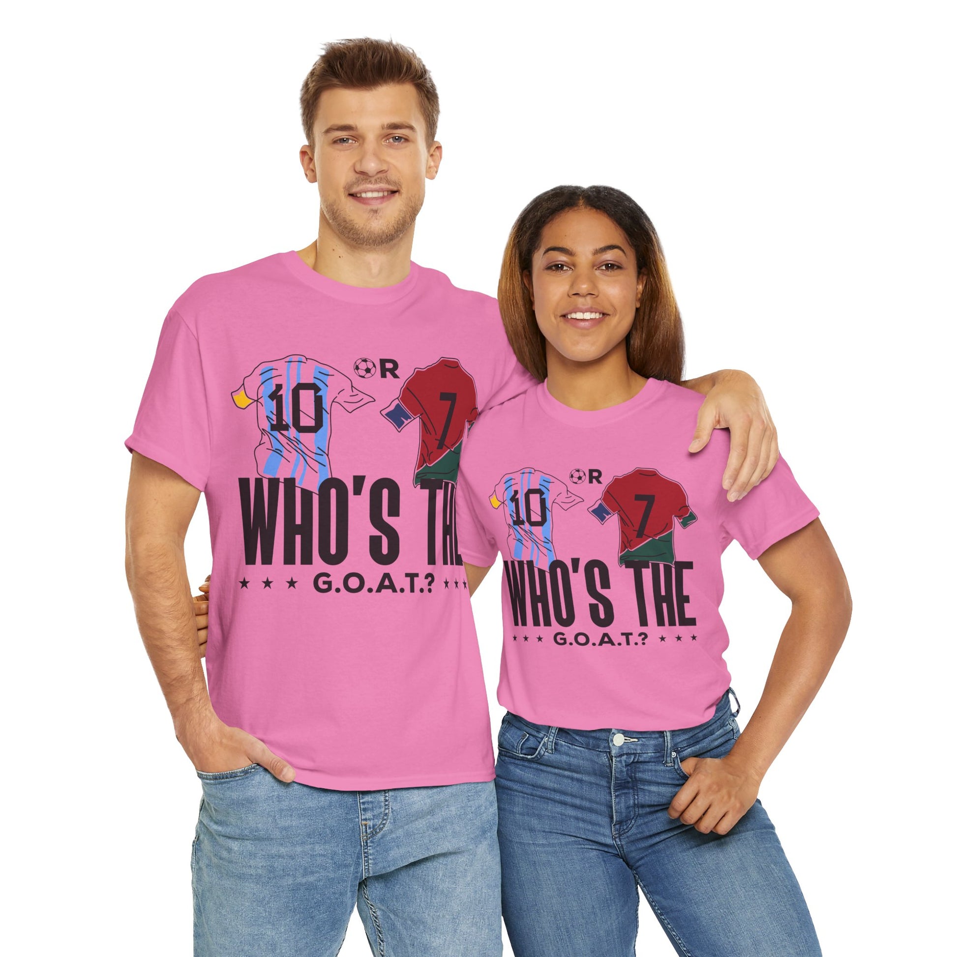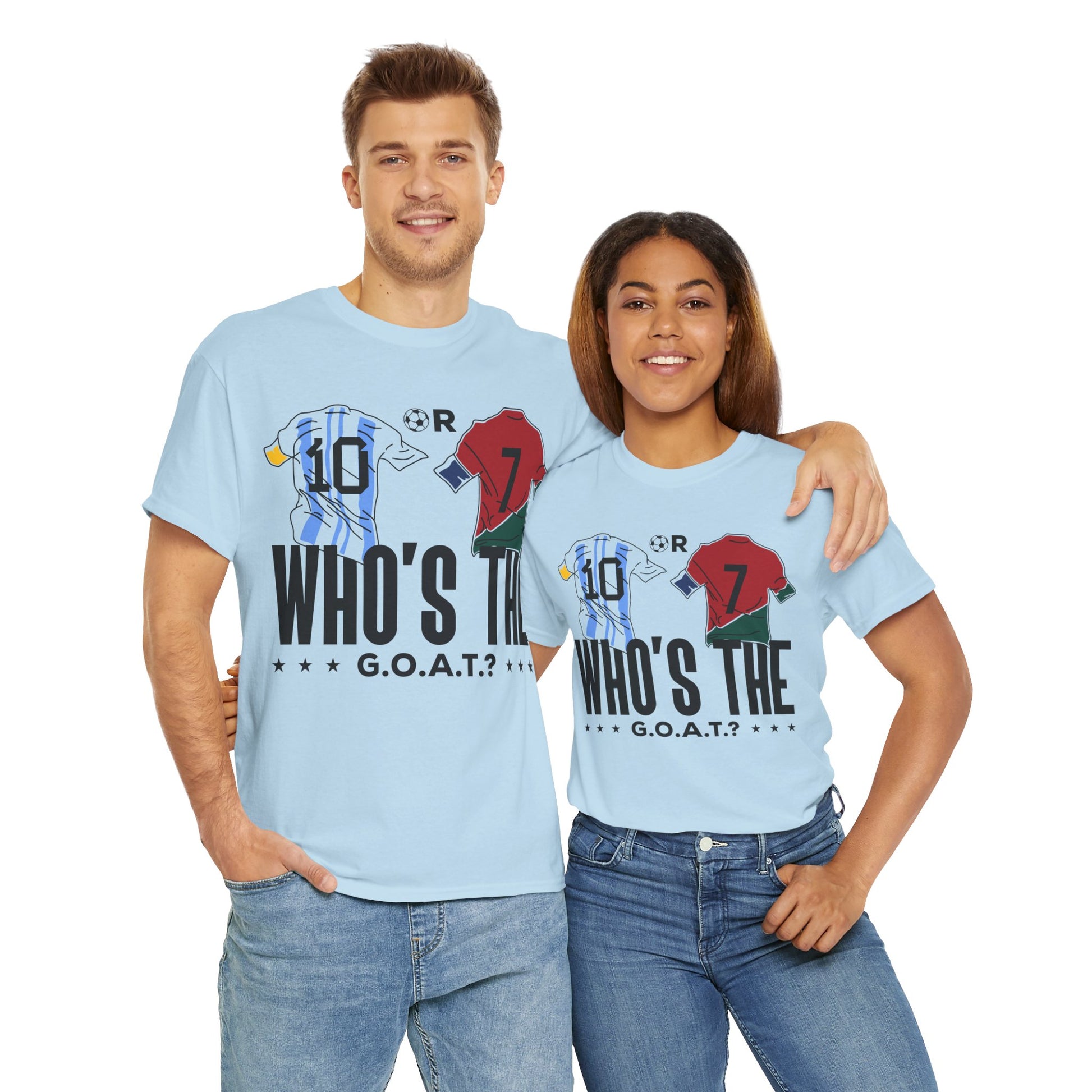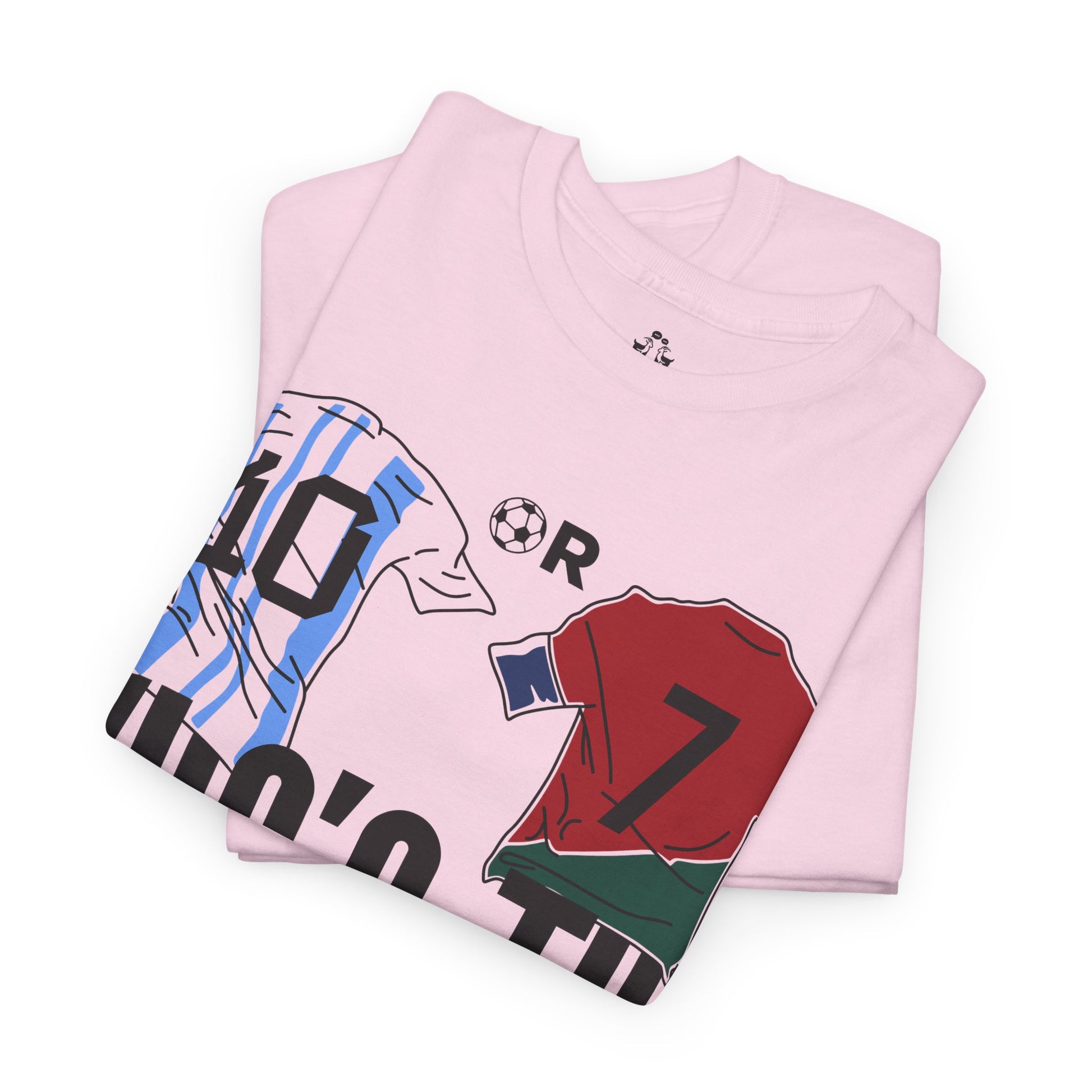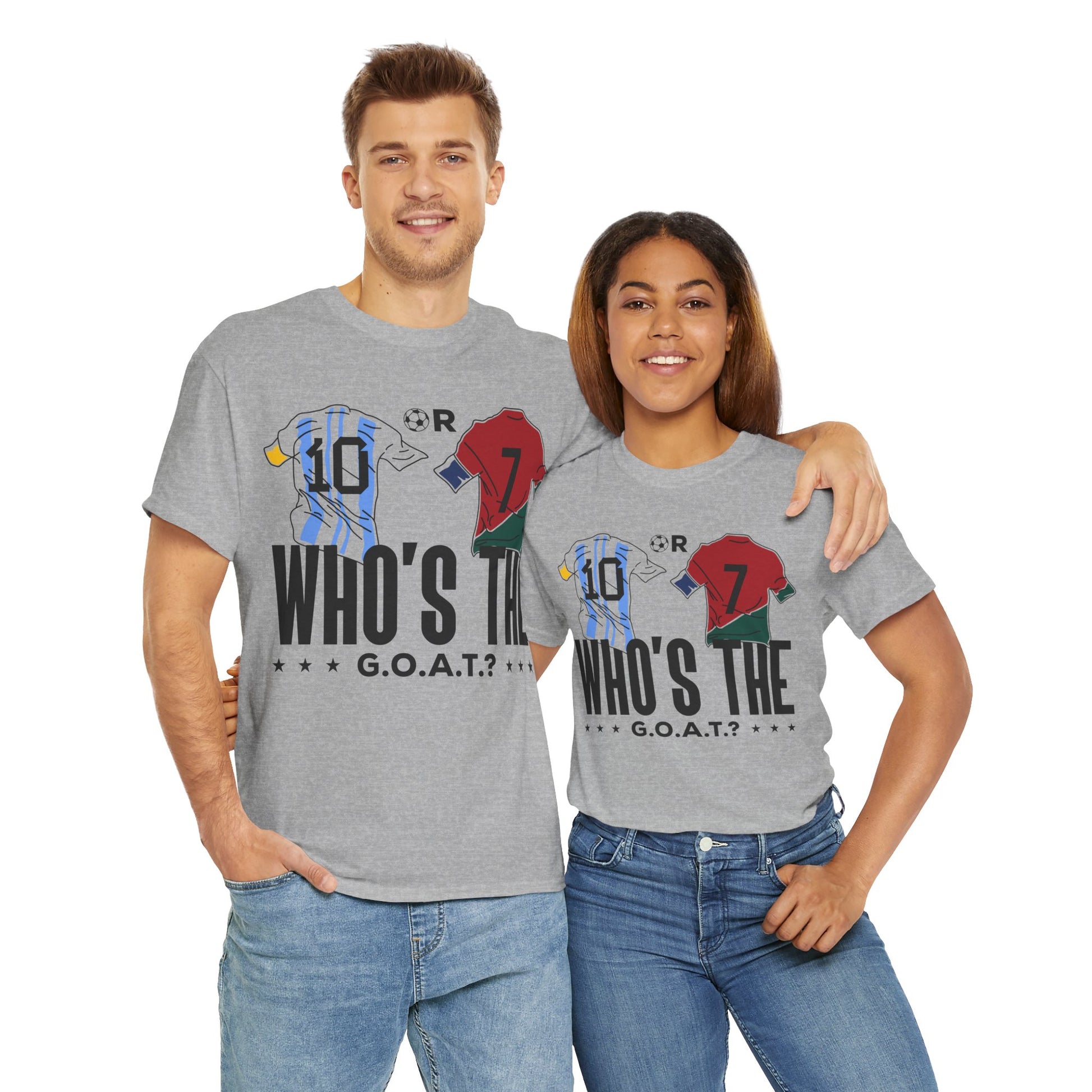 Spark the ultimate soccer debate with this bold "10 or 7 – Who's the G.O.A.T.?" tee. Featuring Argentina and Portugal flag graphics inside the numbers, this shirt lets fans rep their pick between the two football legends. A must-have for Messi or Ronaldo supporters and lovers of the greatest football rivalry of all time.