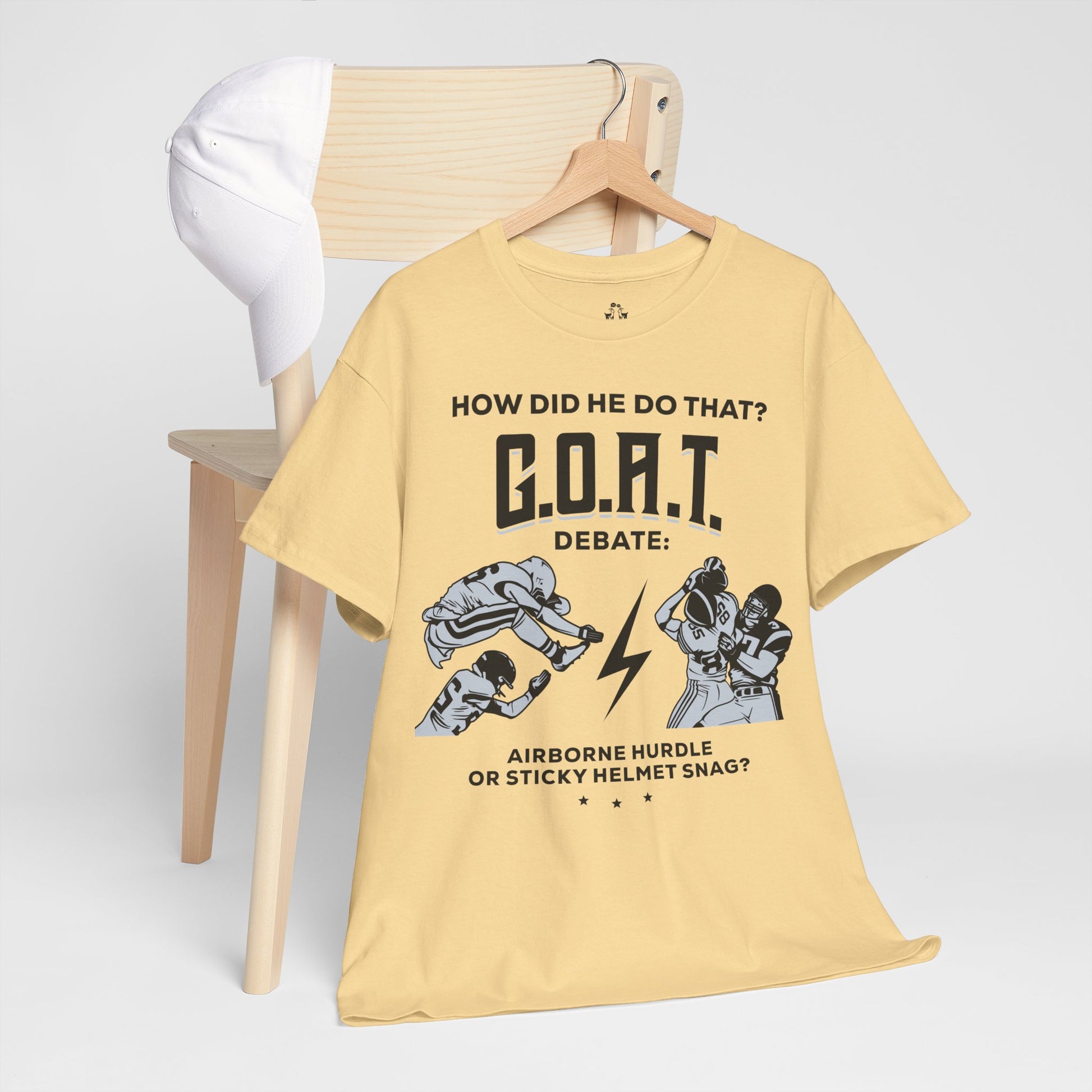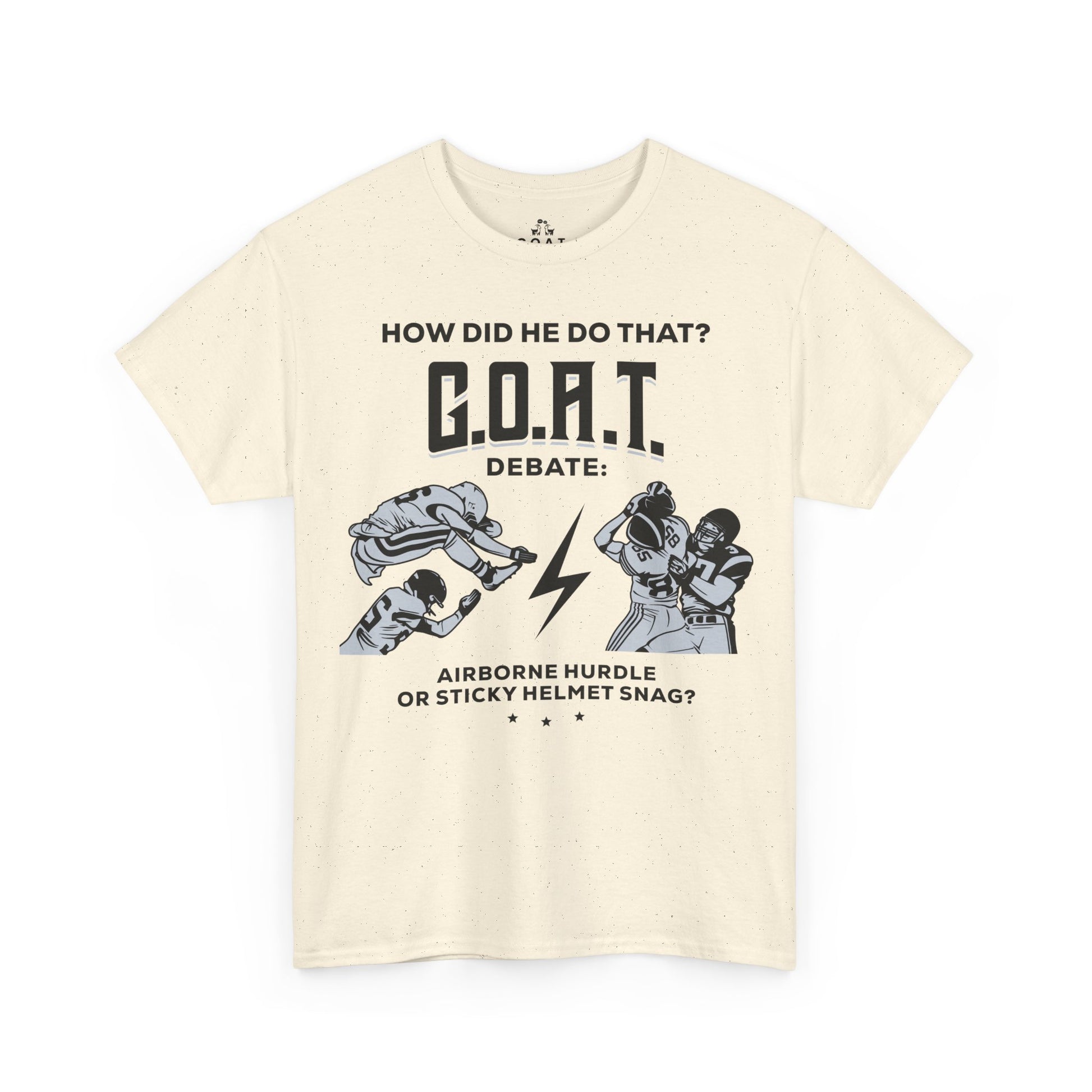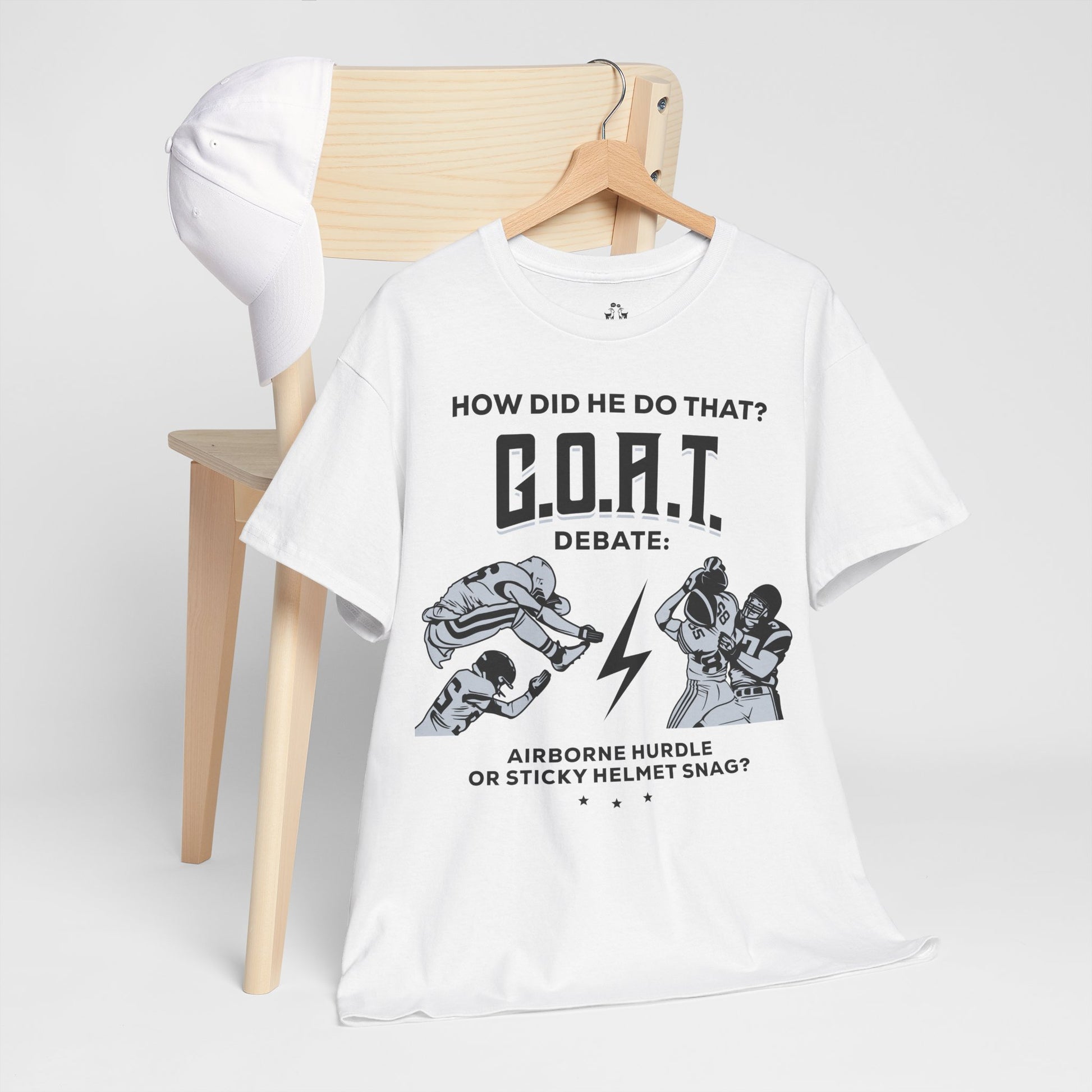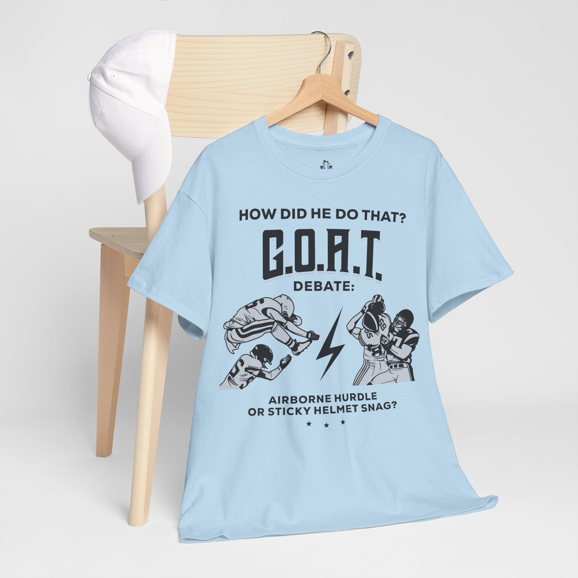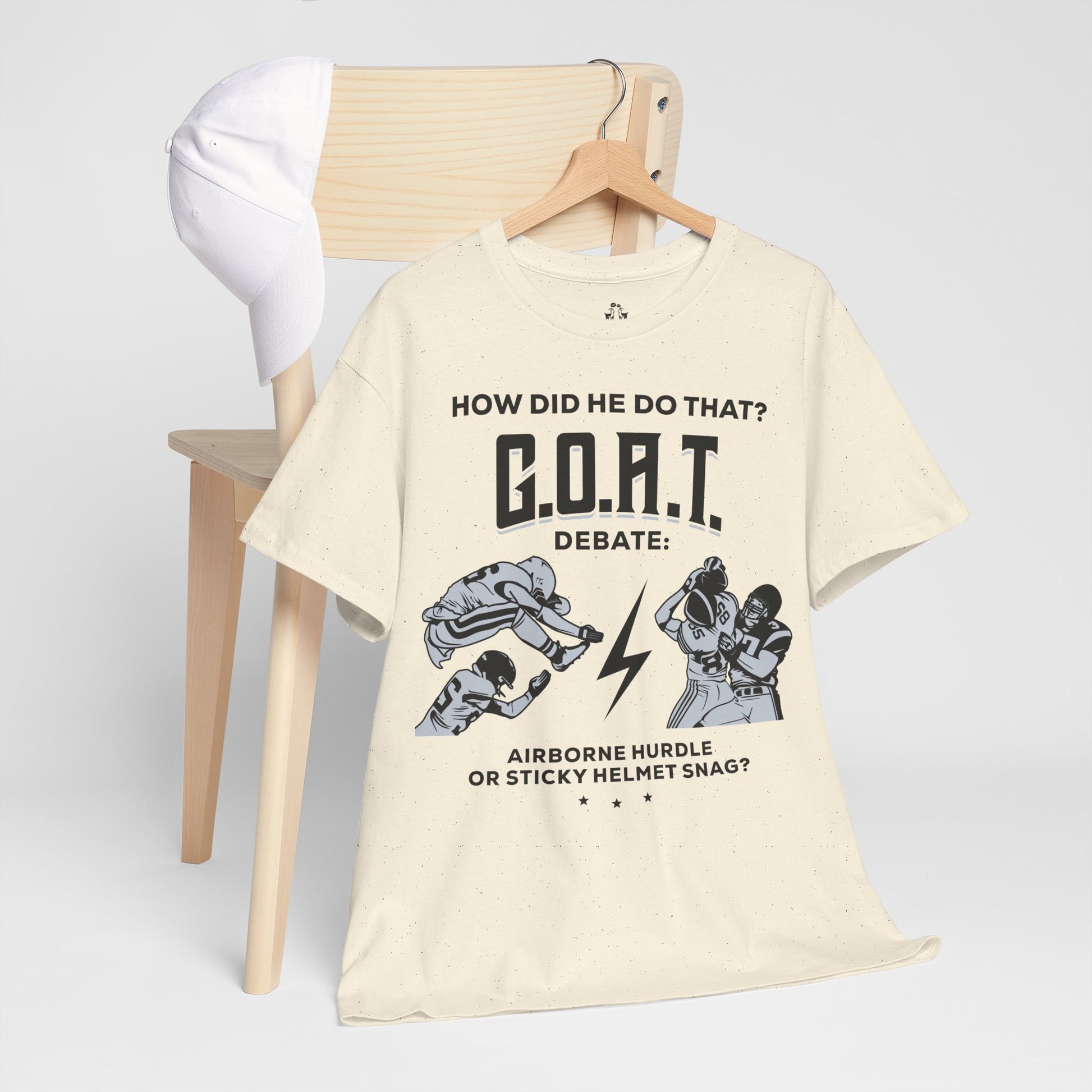 🏈⚡ G.O.A.T. Football Debate T-Shirt – Airborne Hurdle or Sticky Helmet Snag? | G.O.A.T. Talk Tees