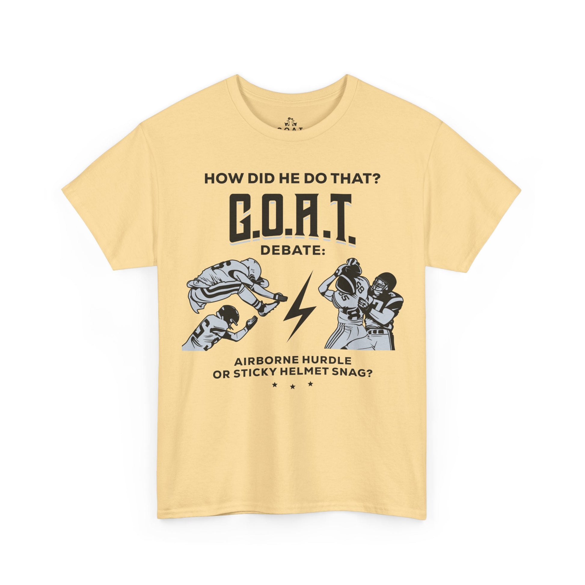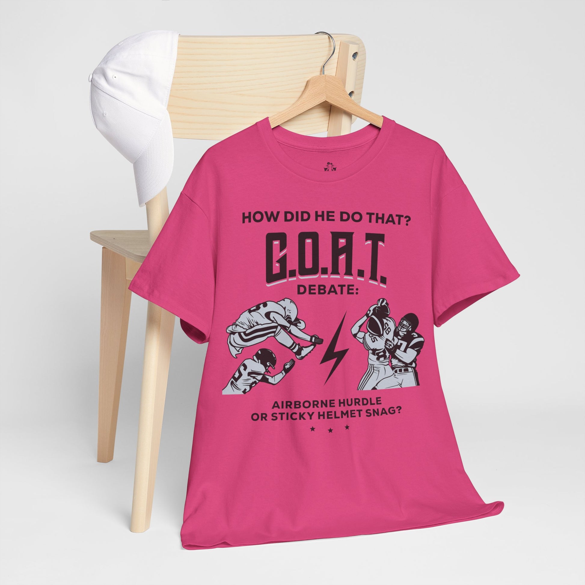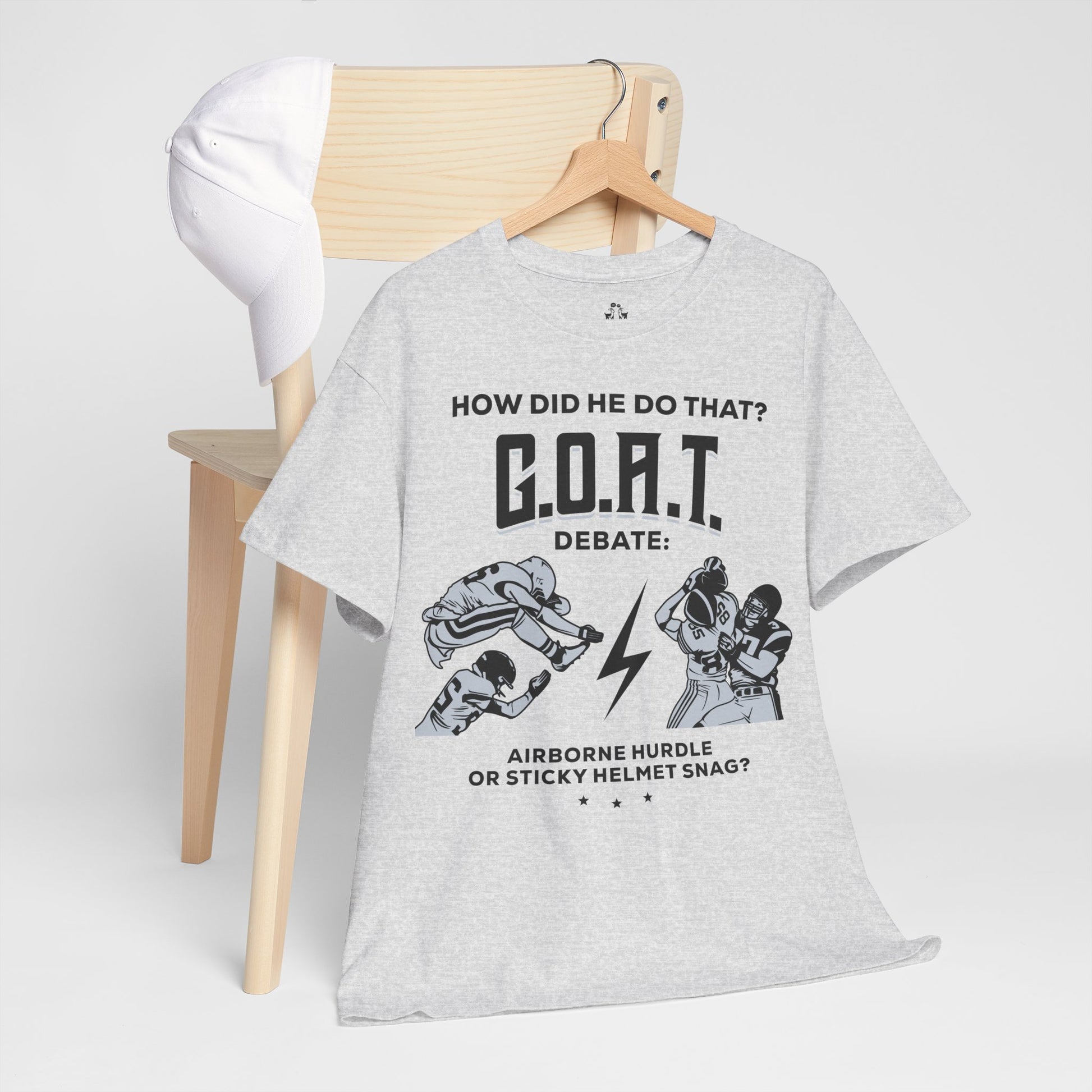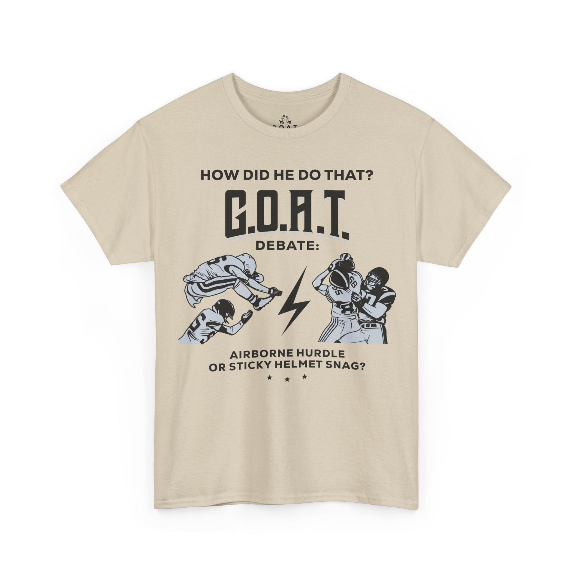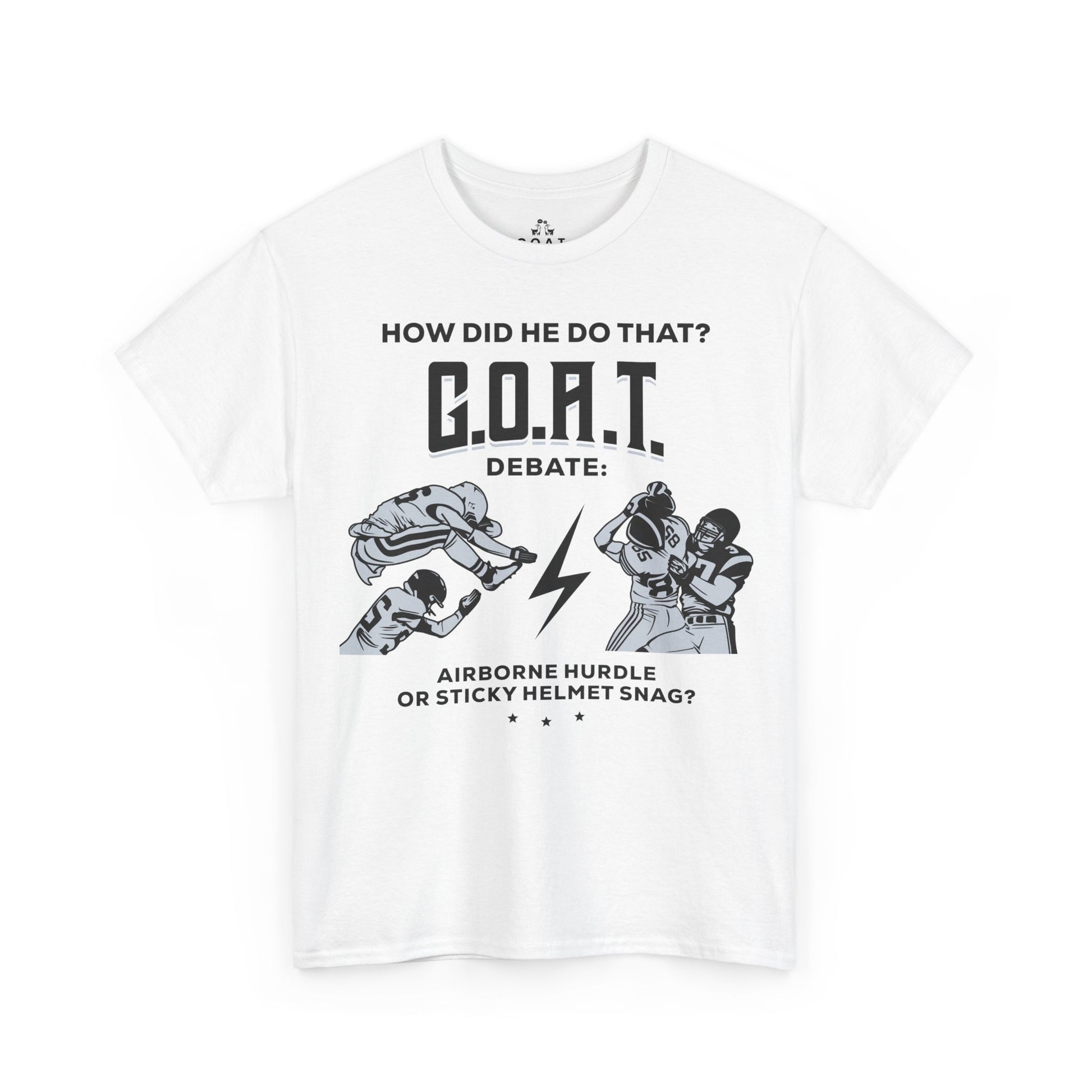 🏈⚡ G.O.A.T. Football Debate T-Shirt – Airborne Hurdle or Sticky Helmet Snag? | G.O.A.T. Talk Tees