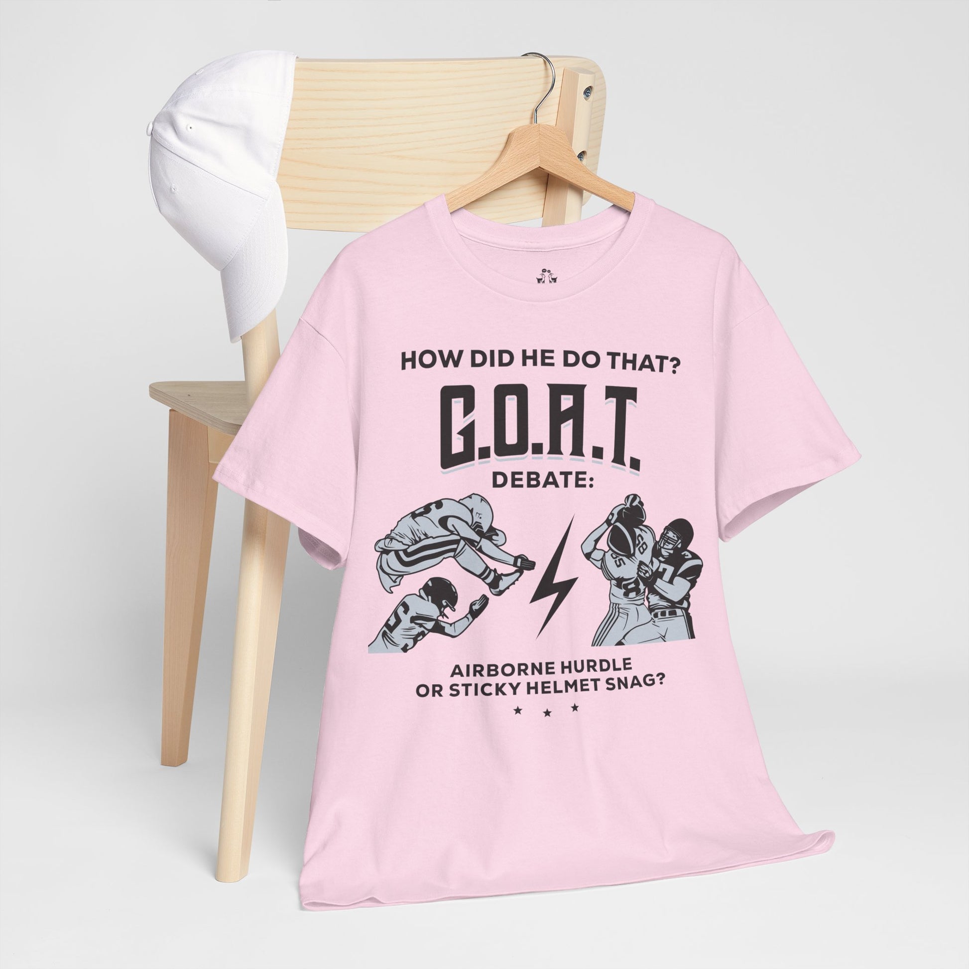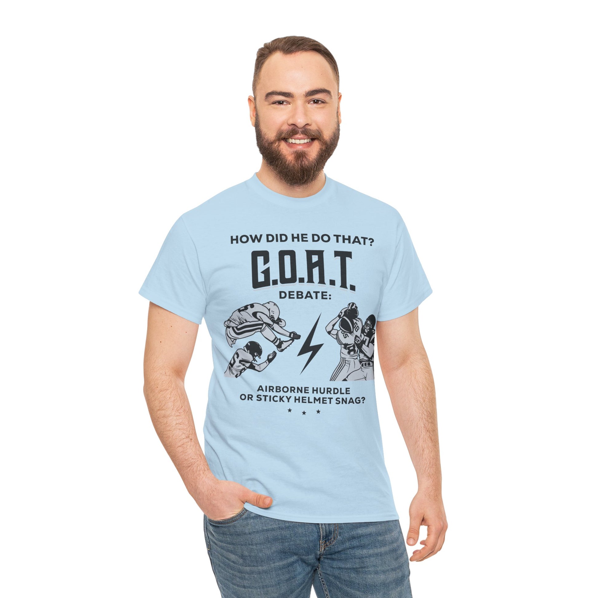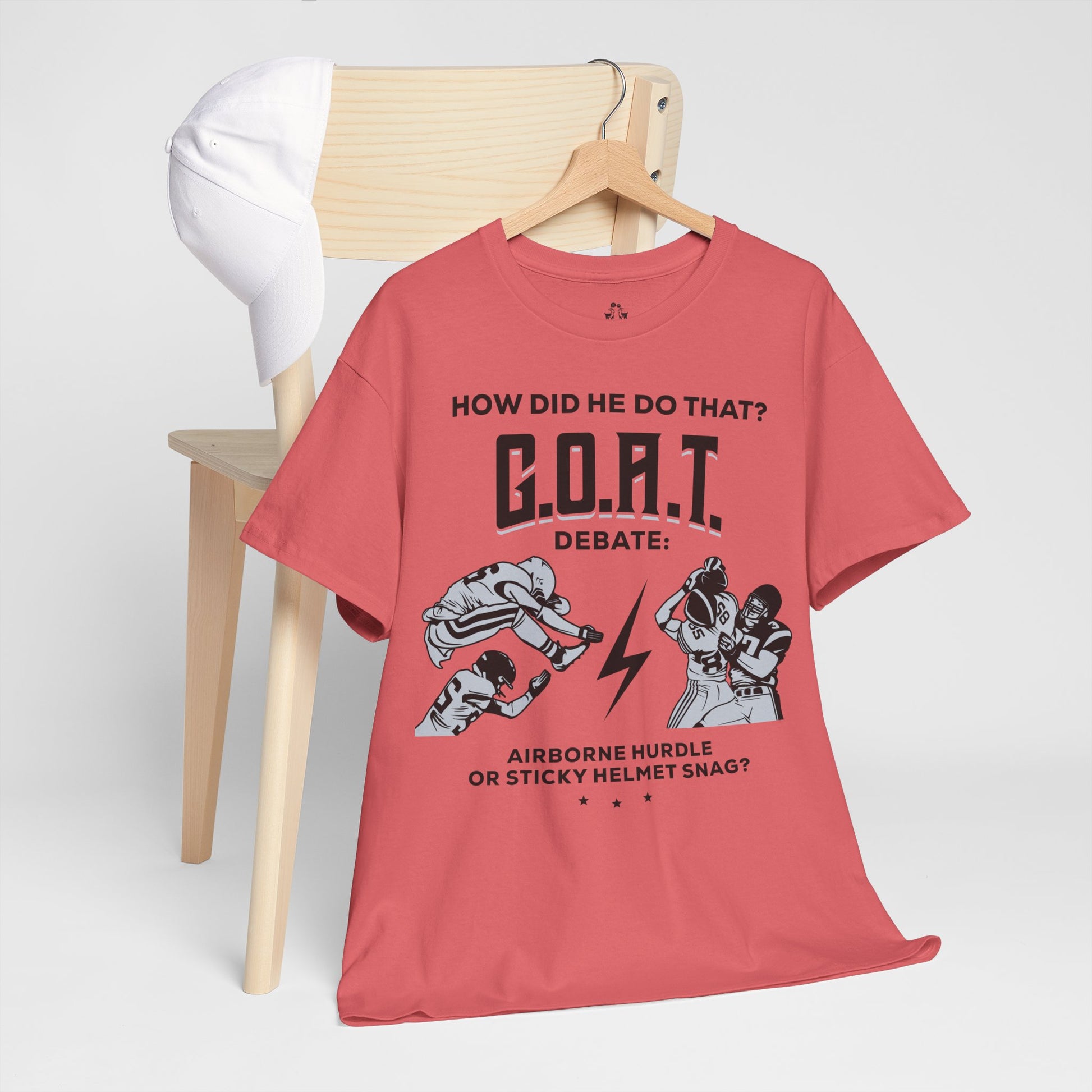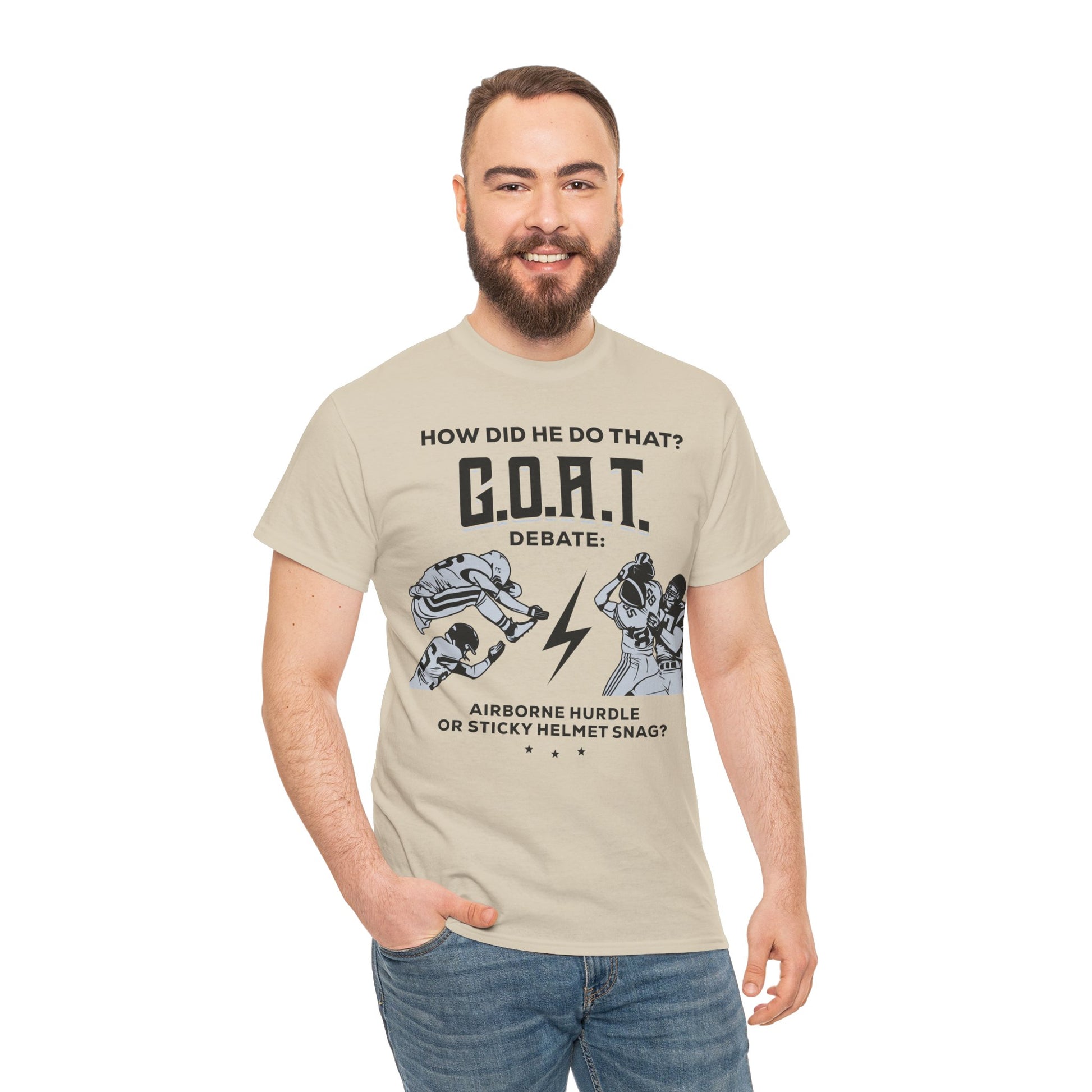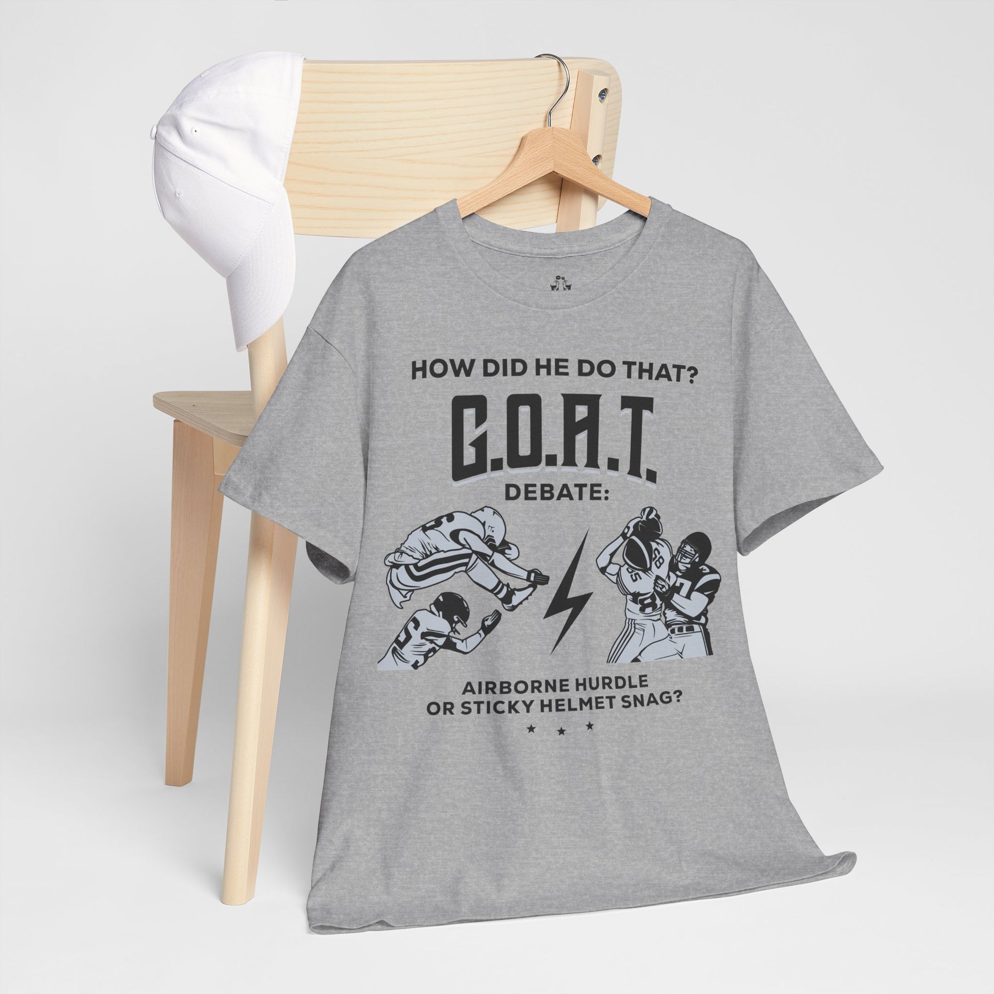 🏈⚡ G.O.A.T. Football Debate T-Shirt – Airborne Hurdle or Sticky Helmet Snag? | G.O.A.T. Talk Tees