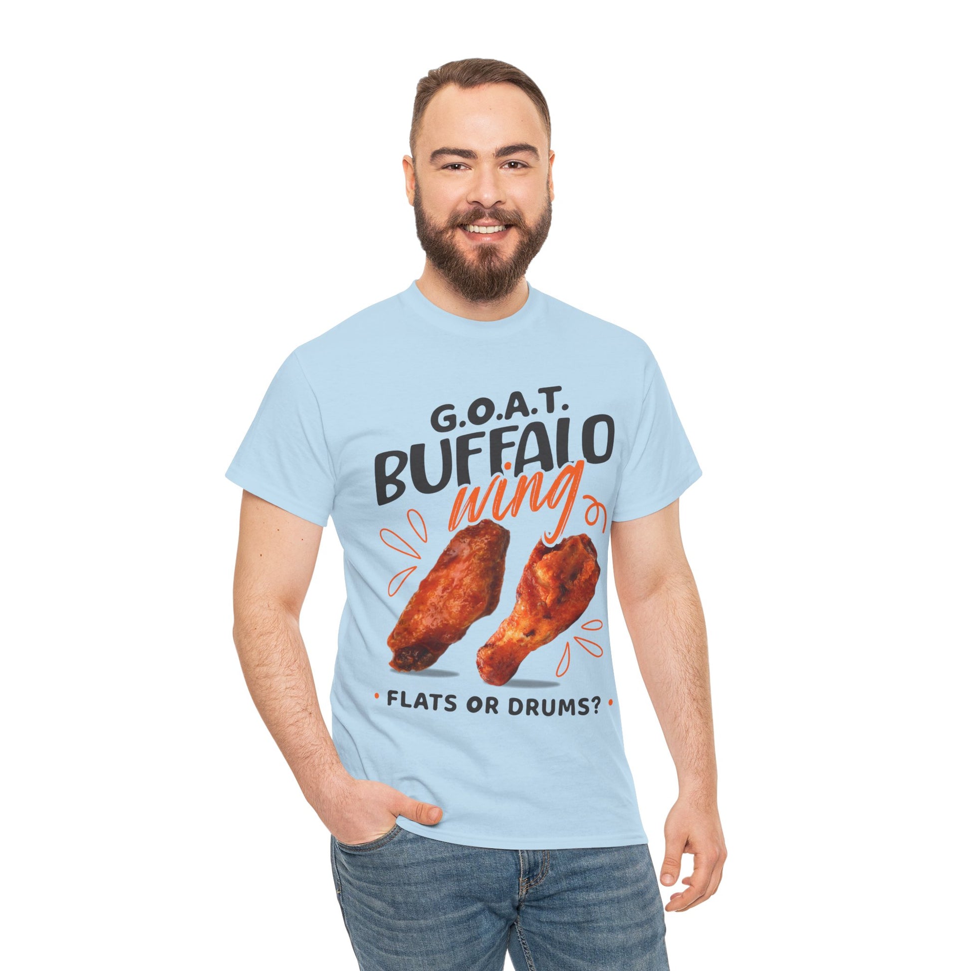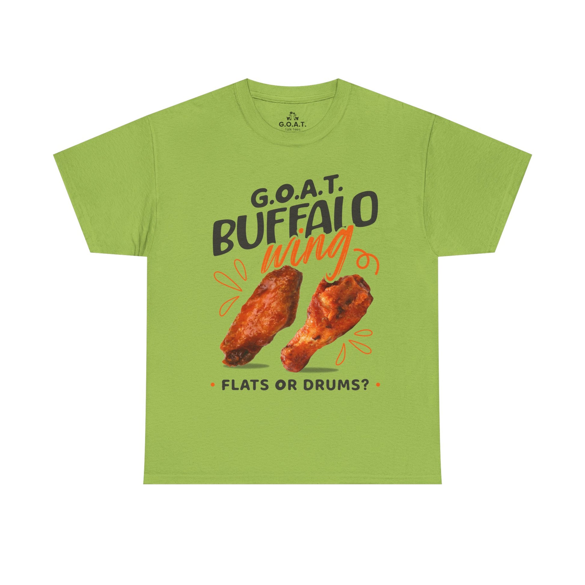 Spark the ultimate wing debate! This G.O.A.T. Buffalo Wings T-Shirt lets you rep your side—flats or drums. Perfect for foodies, sports fans & game nights.