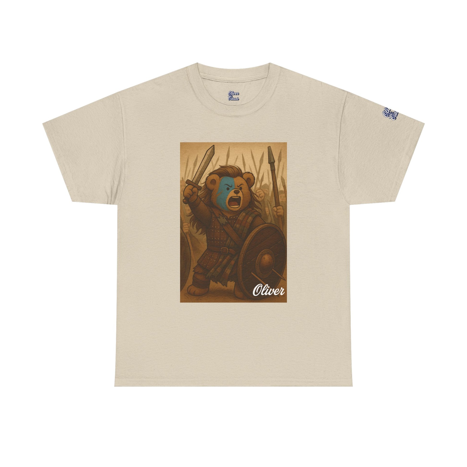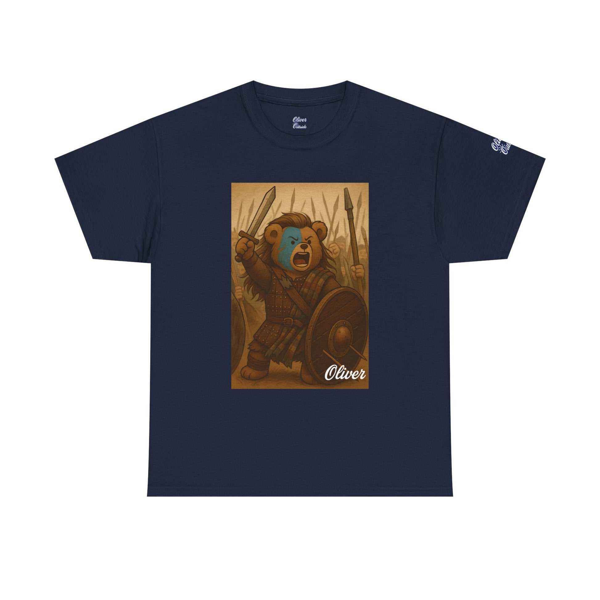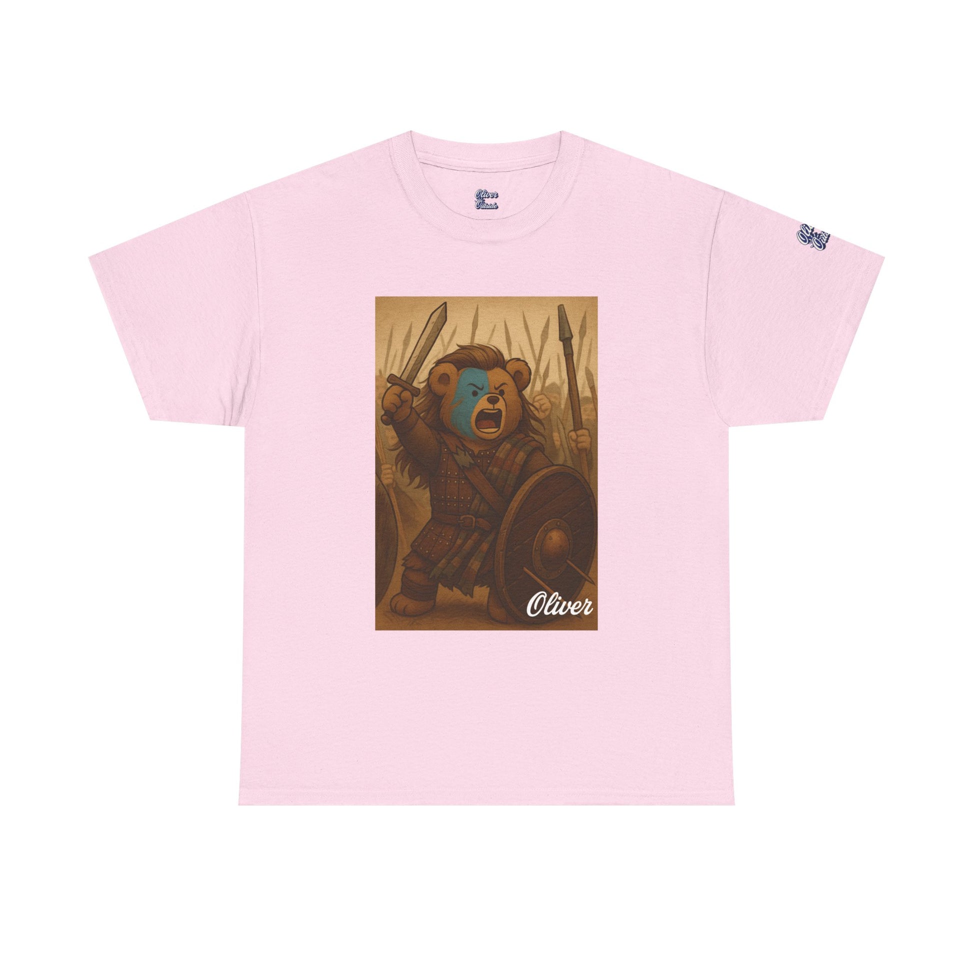 Charge into adventure with Oliver in full warrior mode! This parody tee delivers epic energy, Highland vibes, and a fearless cartoon twist.
