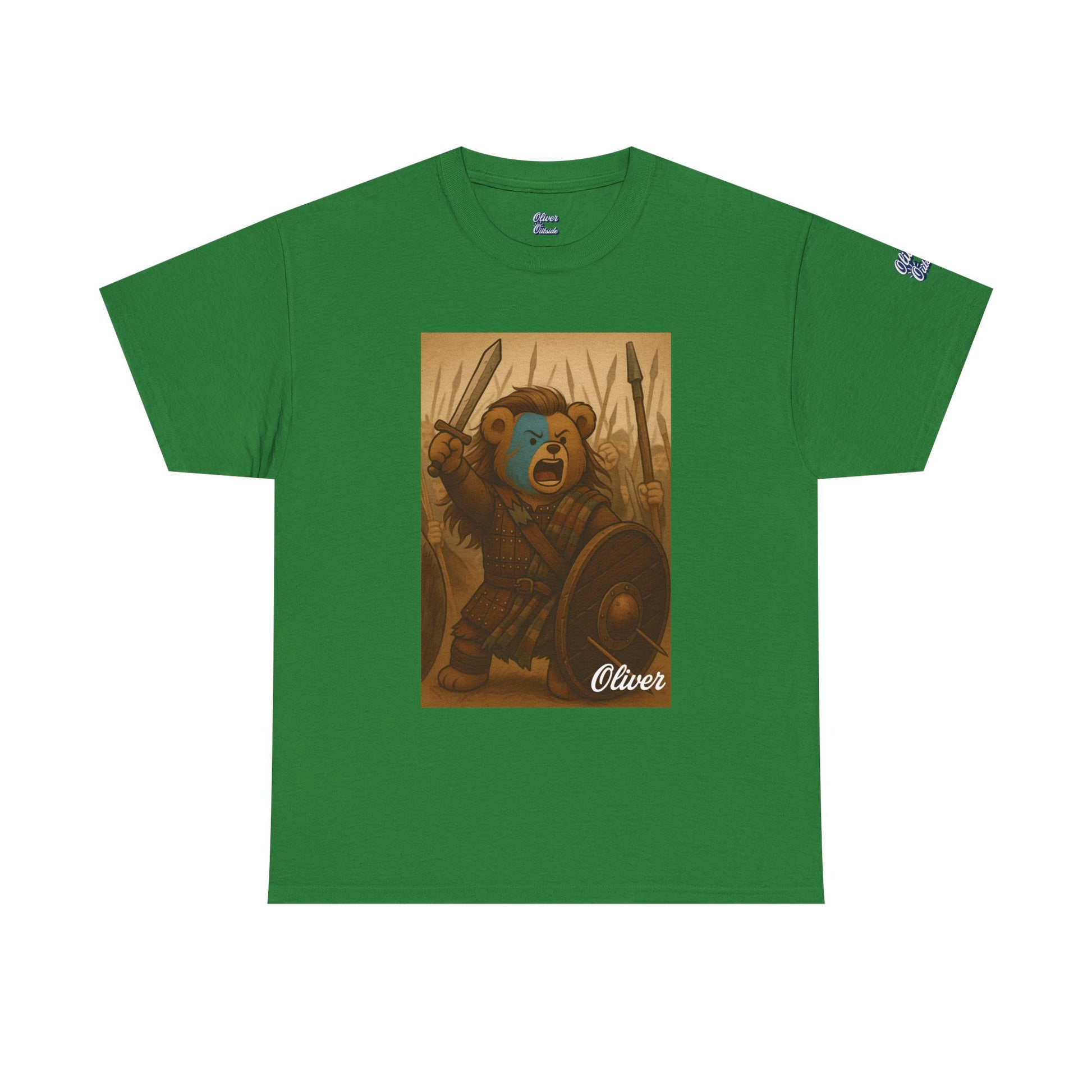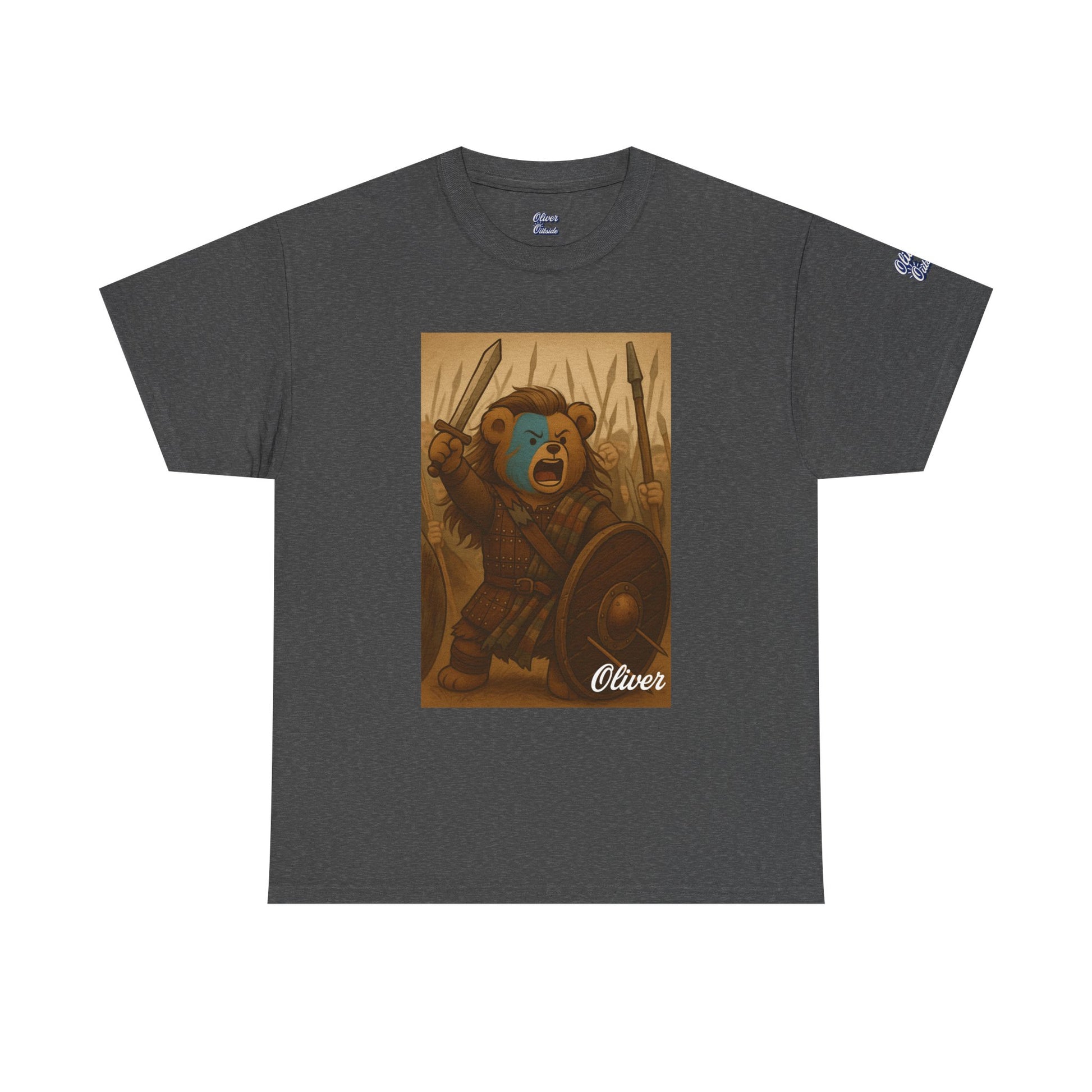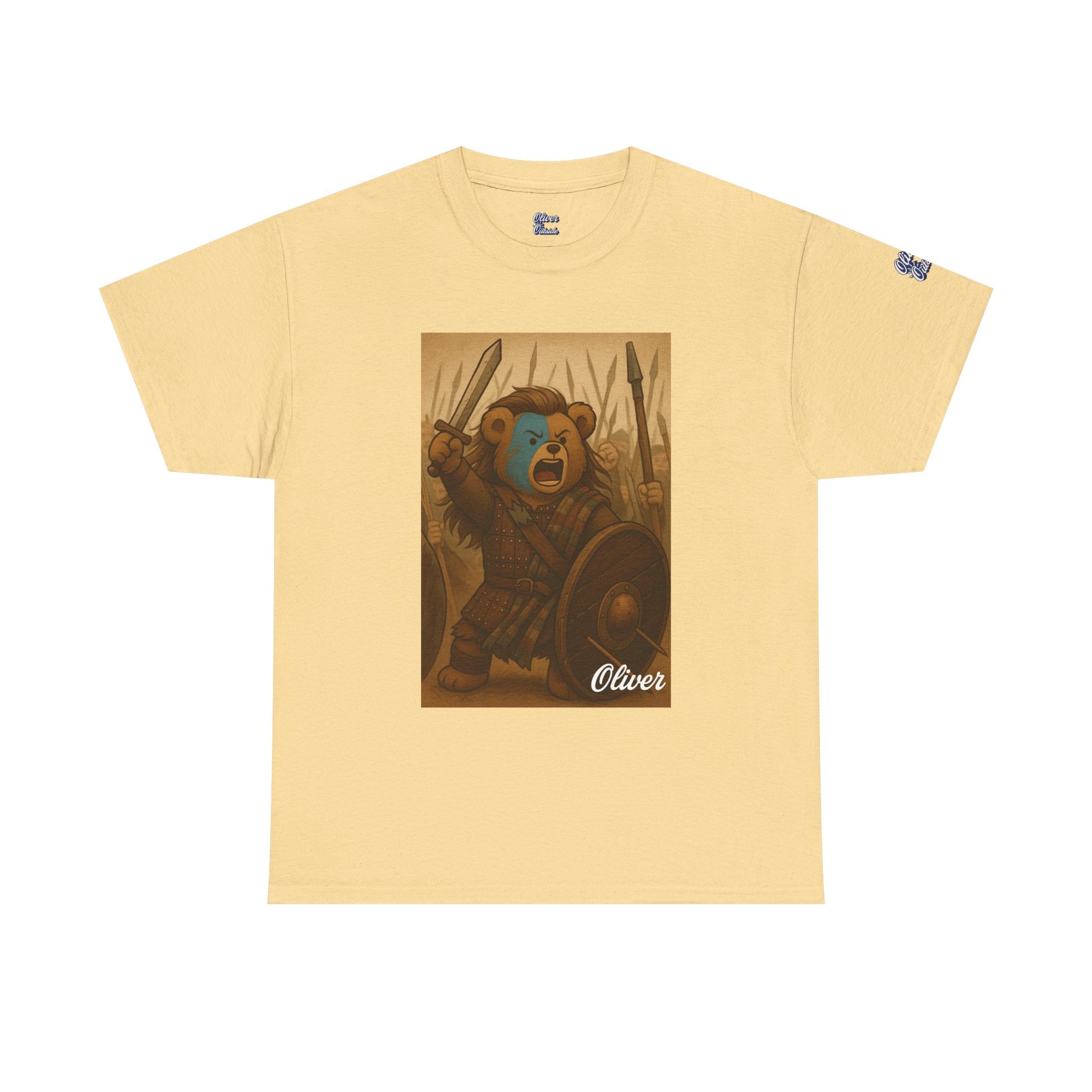 Charge into adventure with Oliver in full warrior mode! This parody tee delivers epic energy, Highland vibes, and a fearless cartoon twist.
