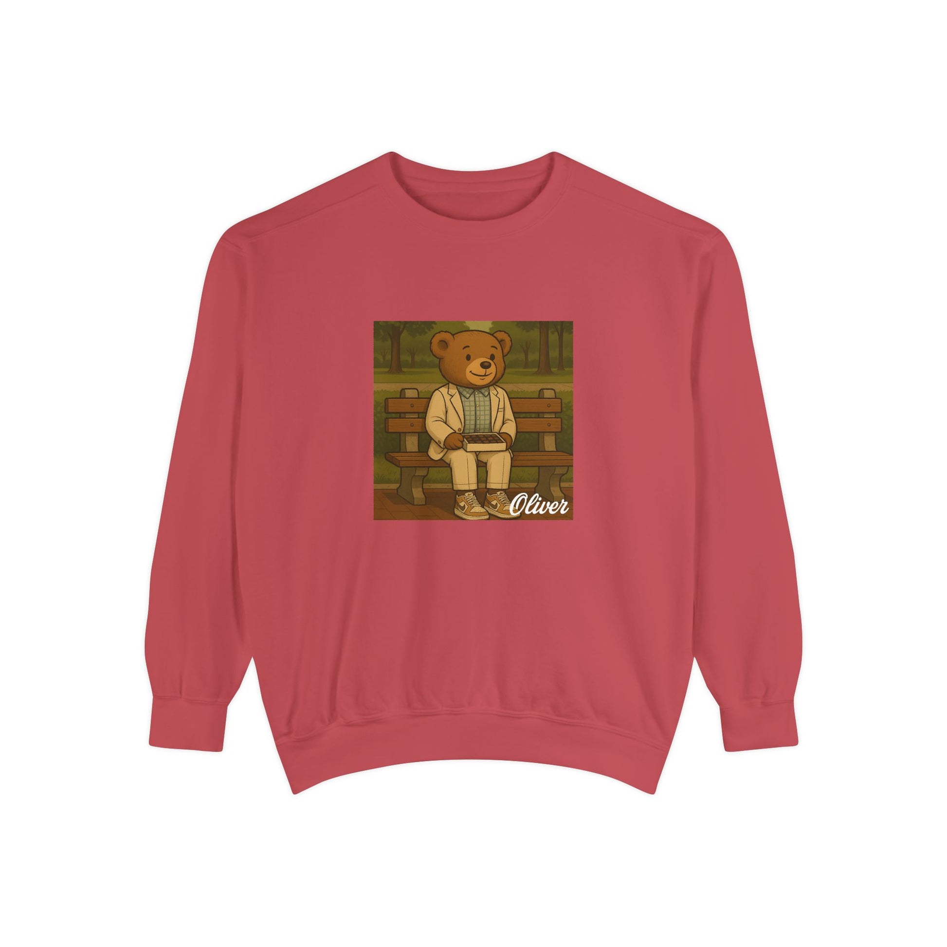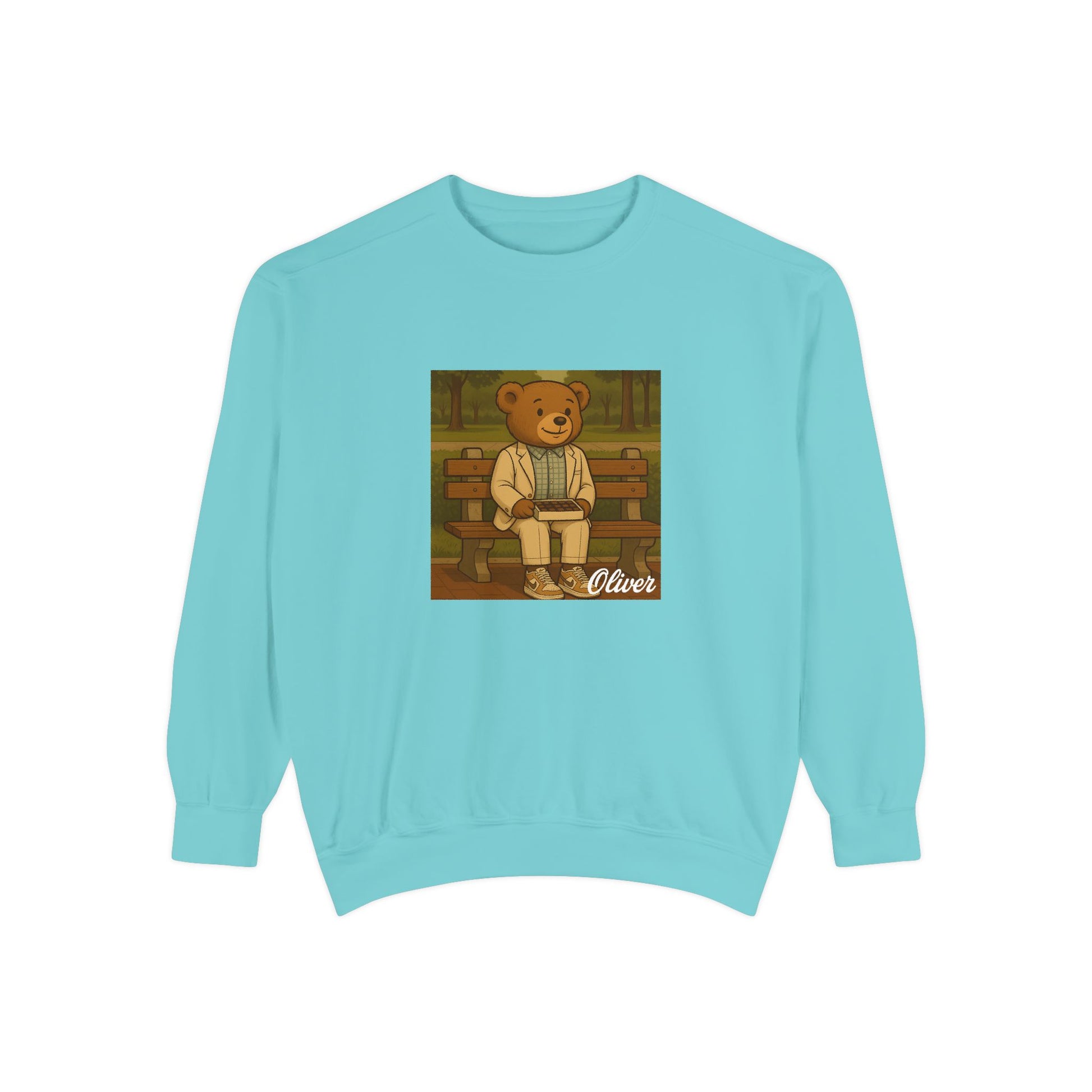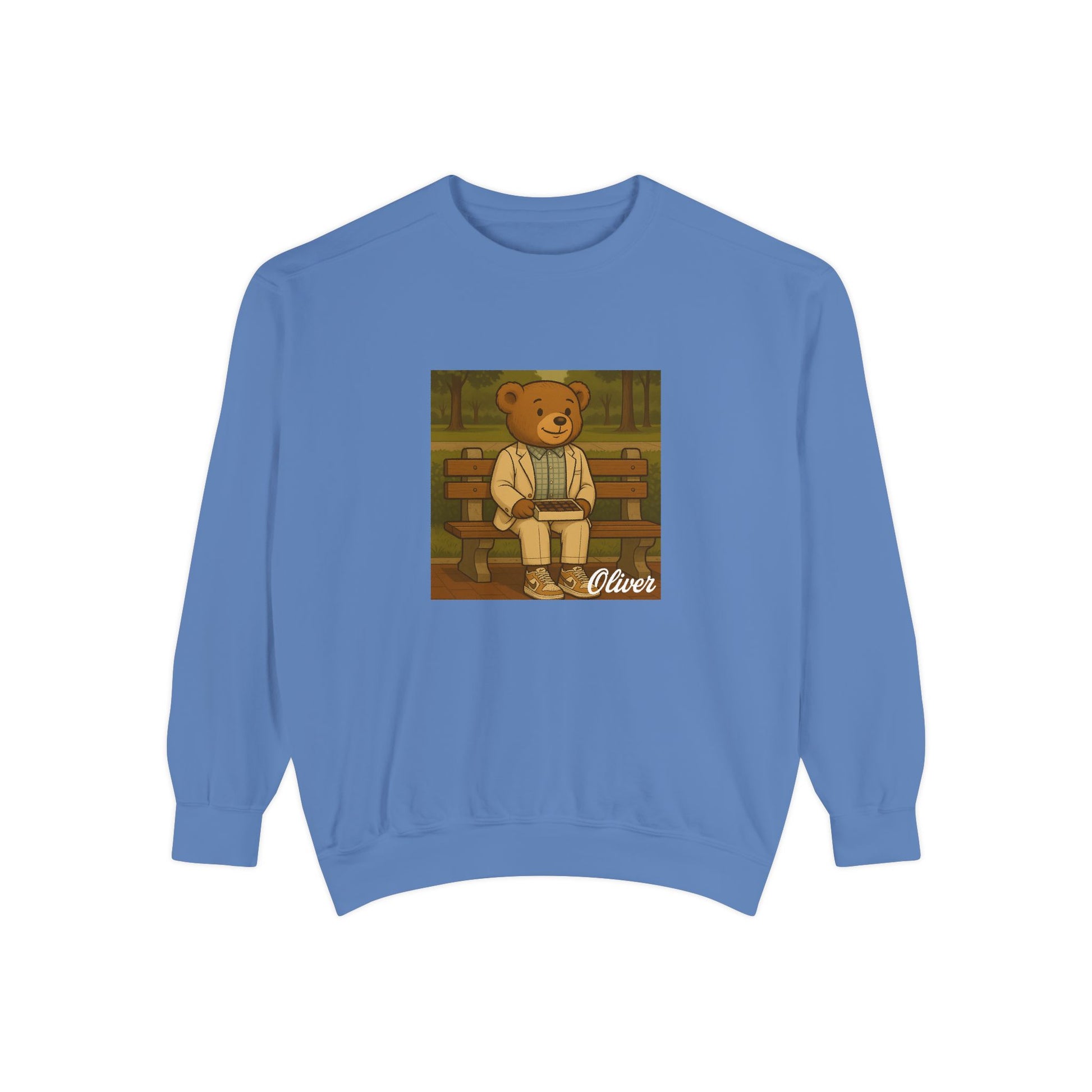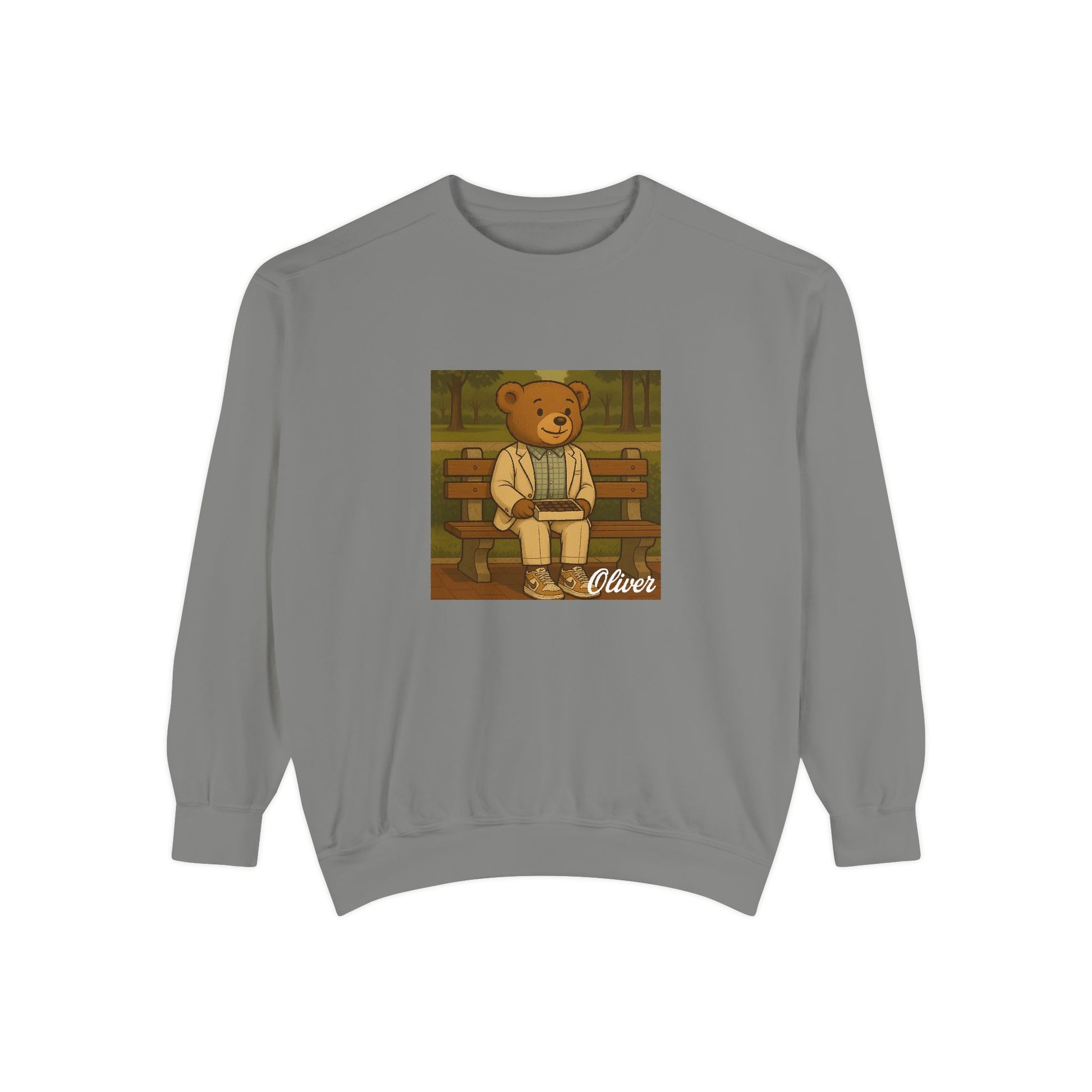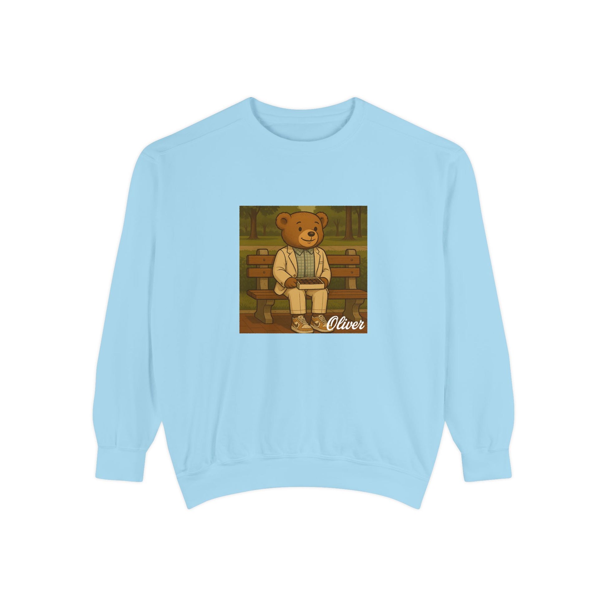Sit down with Oliver in this heartwarming Forrest Gump parody crewneck. A sweet blend of nostalgia, style, and storytelling—box of chocolates not included.
